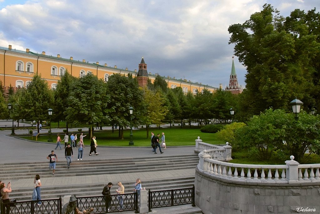 На набережную выходит и мемориальный Александровский сад с Вечным огнём у Могилы Неизвестного солдата. Всем знакомы ели, окружающие этот мемориал, и липы, растущие под стеной Кремля.