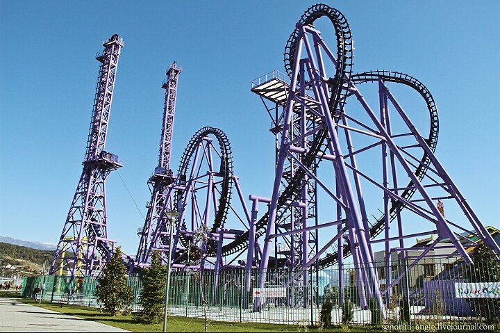 Парк развлечений, названный сочинским Диснейлендом, радует посетителей действительно редкими по своей увлекательности аттракционами. И одним из самых запоминающихся можно назвать «Квантовый скачок» — самую скоростную и высокую в стране воздушную железную дорогу с крутыми во всех смыслах поворотами и изгибами. Максимальная высота пути достигает 58 метров, а скорость миниатюрного поезда 105 километров в час, что при извилистом пути, меняющем ориентацию вагонов в пространстве, производит настоящее потрясение у пассажиров.