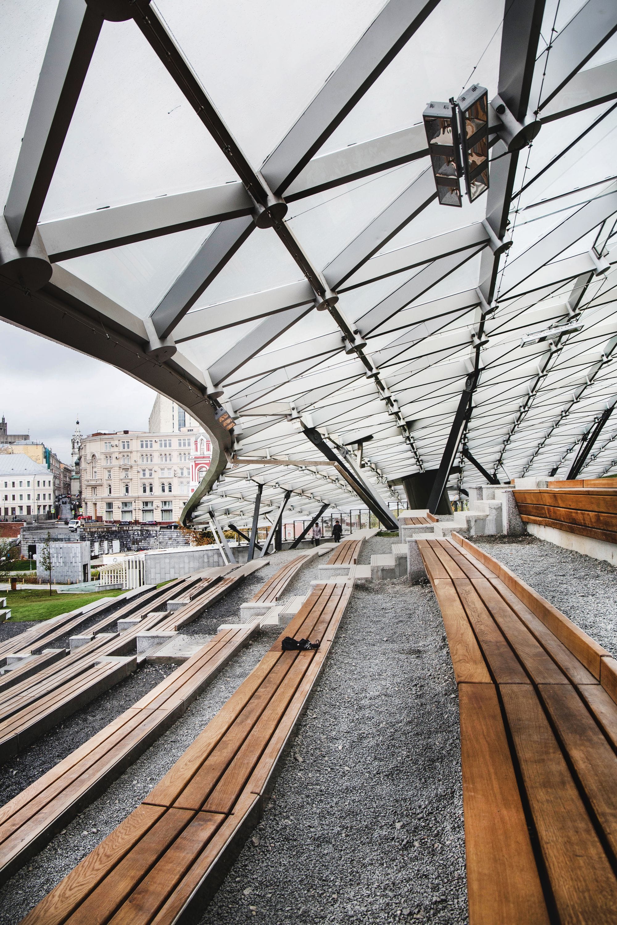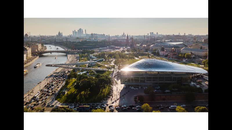 Прочитайте большеДизайнеры постарались превзойти несколько рекордов — крыша концертного зала покрыта самой большой в мире светопрозрачной конструкцией без перегородок.Самый длинный в мире «плавучий мост» проходит через Москву-реку, предлагая посетителям новую смотровую площадку с видом на Кремль.