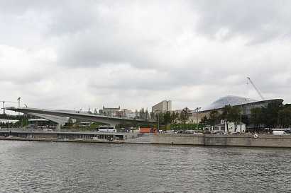 Удивительный объект который несомненно заинтересует посетителей нового парка. Если смотреть на мост, то он будто парит на Москвой-рекой. Отходя от одного берега имеет протяженность 70 метров и возвращается на ту же сторону берега. Вид моста напоминает английскую букву «V». Под мостом нет ни одной опоры, но в то же время мост достаточно прочный и может выдержать нагрузку в 240 тонн, а это около 4000 человек.
