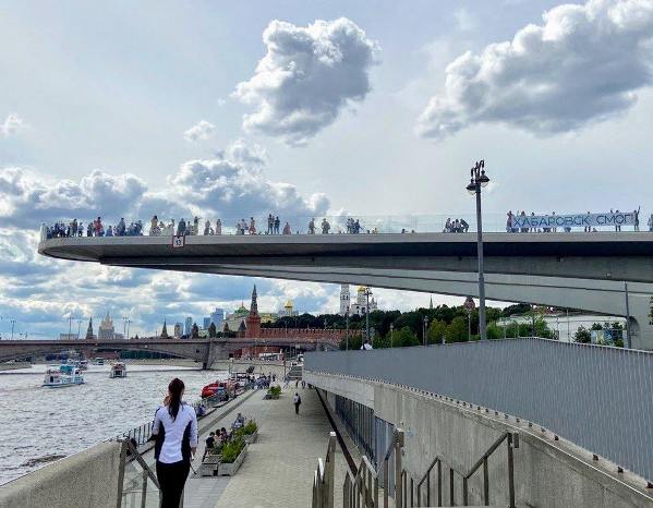 Парящий мост в столичном парке Зарядье весьма привлекателен для туристов. Несмотря на то, что данный объект архитектуры принято называть мостом, он не соединяет берега Москва-реки, а уходит за пределы одного из них.
