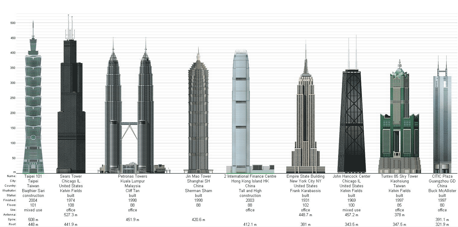 Самый известный небоскреб – Эмпайр-стейт-билдинг в Нью-Йорке (1931), он более 40 лет оставался самым высоким в мире, но потом рекорд перешел к другому американскому зданию, башне «Сирс» в Чикаго (1974). И еще 20 лет никто не мог превзойти новую высоту.