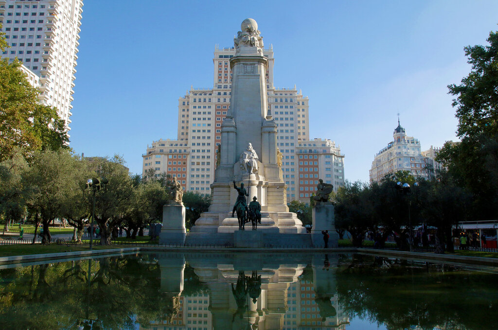 С другой стороны, площадь обрамляют два знаменитых небоскрёба, образующие один из самых интересных архитектурных ансамблей города: башня Мадрид и здание Испании, в котором в настоящее время размещён отель класса «люкс» Riu Plaza España.