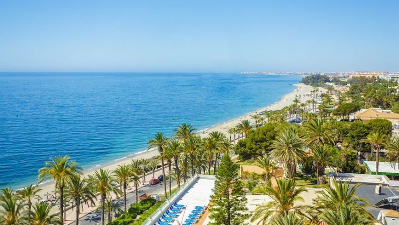 Menschen, die entlang der von Palmen gesäumten Strandpromenade в Лос-Ареналес-дель-Соль spazieren gehen.