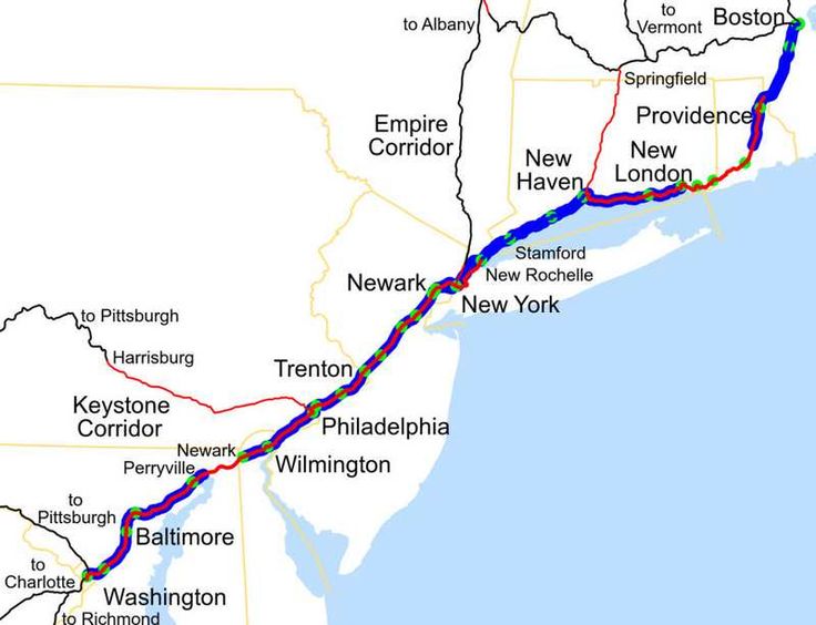 Протяженность железнодорожной ветки от Бостон до Нью-Йорк составляет 254 км. Совет: перед тем, как уютно устроиться на полке в вагоне, посмотрите на карту: может, маршрут пролегает мимо каких-то интересных мест и достопримечательностей, и есть смысл разбить поездку на несколько частей?
