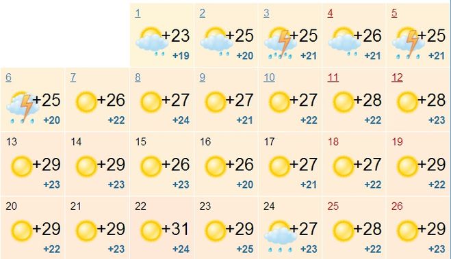 Спасительной прохлады не приносит и ночь, когда становится прохладнее на 3-4 градуса по сравнению с дневными отметками. Зной переносится не так сложно благодаря низкой влажности воздуха, составляющей не более 48%. Все начнет меняться к концу месяца, когда жара станет постепенно отступать.
