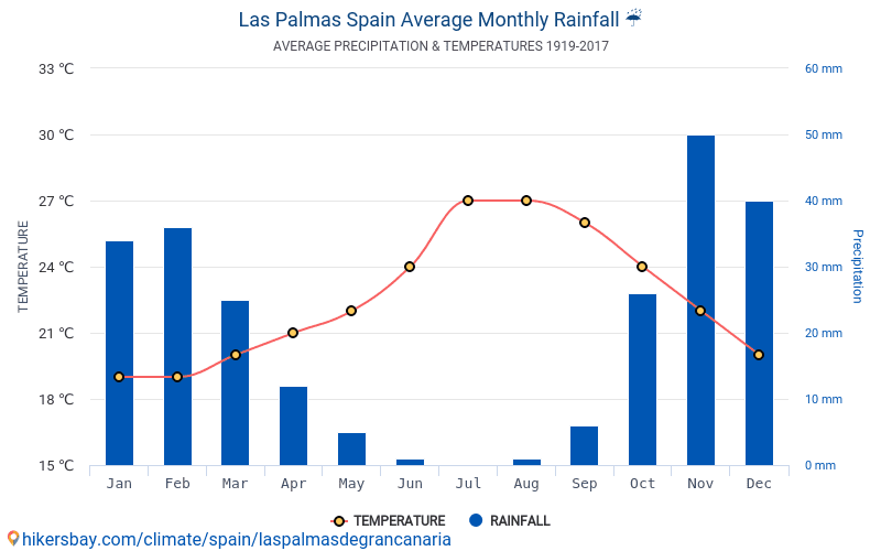 Температура редко опускается ниже в среднем 24 ° C в течение года, и, несмотря на то, что Гран-Канария находится в Атлантическом океане, всего за 12 месяцев выпадает всего 148 мм осадков. Большая часть этого приходится на период с октября по февраль, а июль и август очень засушливые.