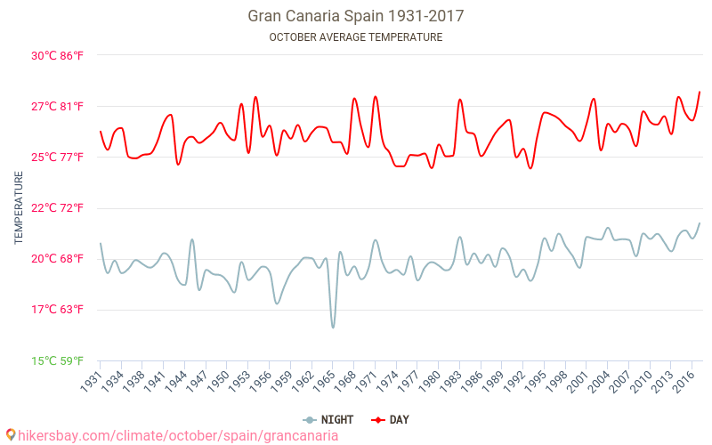 На графике ниже представлена детальная информация о дневной и ночной температуре воздуха на Гран-Канарии в октябре.