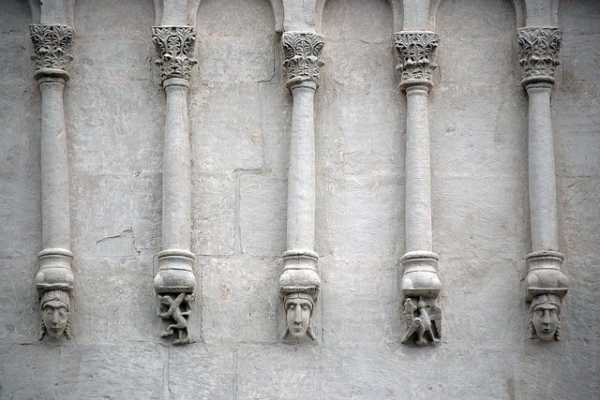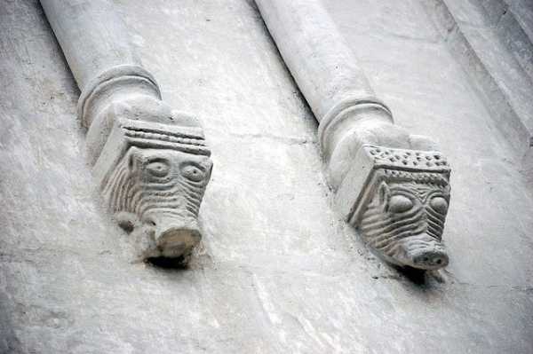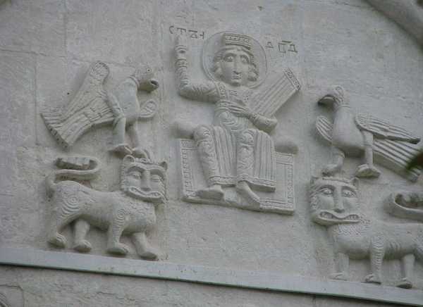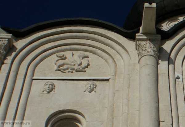 Под боковыми дугами храма изображены грифоны с ланями в лапах. Однако это вовсе не образ хищного зверя, как можно иногда встретить в описаниях резьбы собора. В средневековых традициях грифон считался символом Сына Божьего, а лань – символом трепетной христианской души. И грифон отнюдь не терзает бедную лань, а, напротив, бережёт и охраняет её.