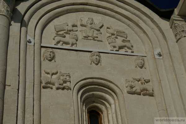 Над входом вырезано изображение царя Давида с музыкальным инструментом в руке. Давид особо почитается в христианстве как мудрый и справедливый пастырь-правитель. Ниже – львы (символ мудрости и власти) и голуби (символ мира). Этот сюжет повторяется на трёх стенах храма.