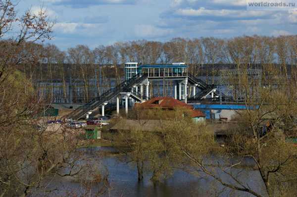 Вот он – разлив! Всё, что за железнодорожным полотном – скрыто под водой. Лестница пешеходного моста уходит прямо под воду и больше напоминает причал.