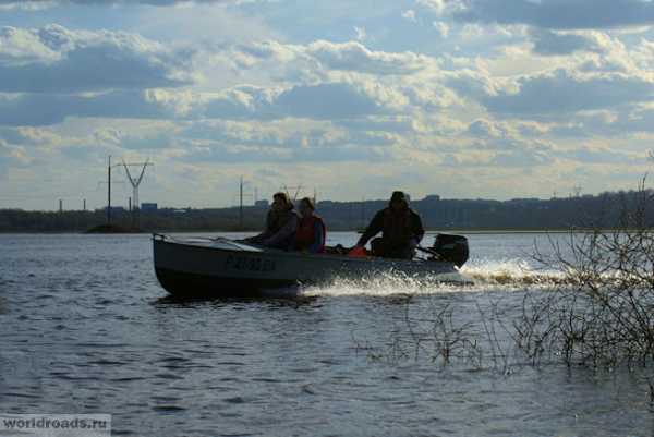 Подойти и правда невозможно. Но мы арендовали моторную лодку и на ней добрались до маленького островка, образованного разливом. Я в первый раз в жизни плавала на моторке. На катерах плавала, на вёслах ходила (и даже сама грести немного умею, у родителей была надувная лодка с вёслами), на теплоходах каталась, а вот на моторке – впервые.