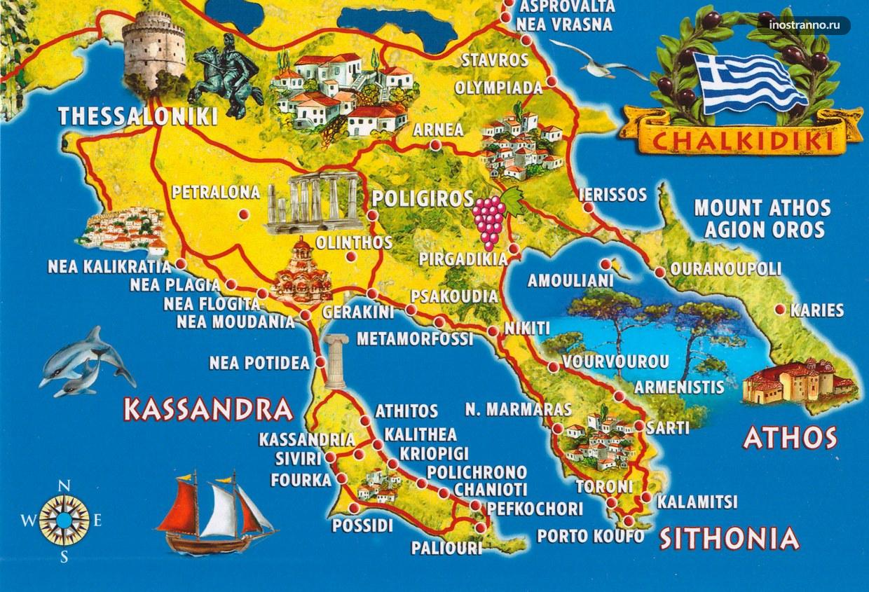 Халкидики имеет необычную форму. Он состоит из трех полуостровов в форме пальцев: Кассандра, Ситония и Афон.Если вы не планируете оставаться на одном месте, то лучше всего бронировать жилье между «пальцами» — например, в Еракине, Псакудии, Агиос Николаосе или любом другом поселке поблизости. Это облегчит и ускорит передвижение по полуострову.