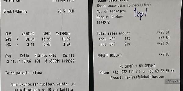 5.После оформления квитанции продавец упакует Ваши покупки, опечатает специальной лентой и наклеит номер квитанции. Вы не должны распечатывать пакет или использовать приобретенный товар на территории страны в которой приобрели данную покупку, иначе потеряете право на возврат налога. Имейте в виду — на территории Финляндии это не просто формальность: при выезде из страны в пунктах возврата такс-фри Вас попросят предъявить упаковку, и убедившись, что товар Вами не использовался, вернут наличные по квитанции.