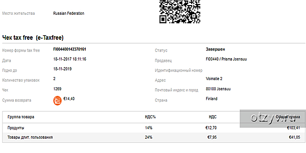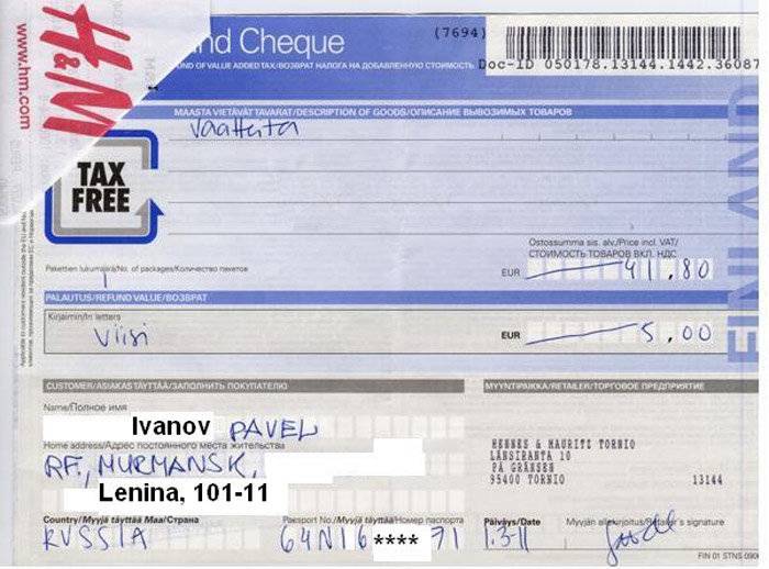 — это возврата НДС. Совершая покупку в магазине, Вы оплачиваете полную сумму. Вам дают чек-инвойс, на границе нужно поставить таможенную отметку (штамп). В следующий раз приехав в Финляндию, отдать счет (чек) в этот же магазин, и Вам вернут сумму НДС. Бухгалтерия магазина после этого предоставляет данные в налоговую и за данную продажу не отчисляет НДС государству, потому что есть подтверждение вывоза товара за территорию ЕС.