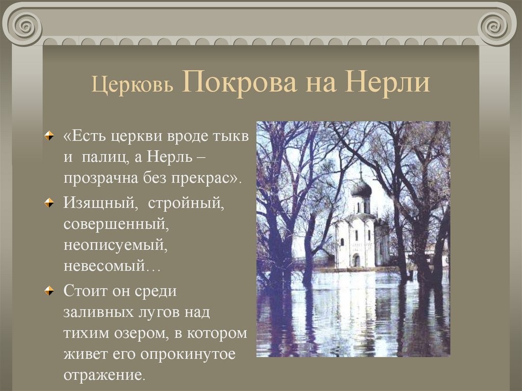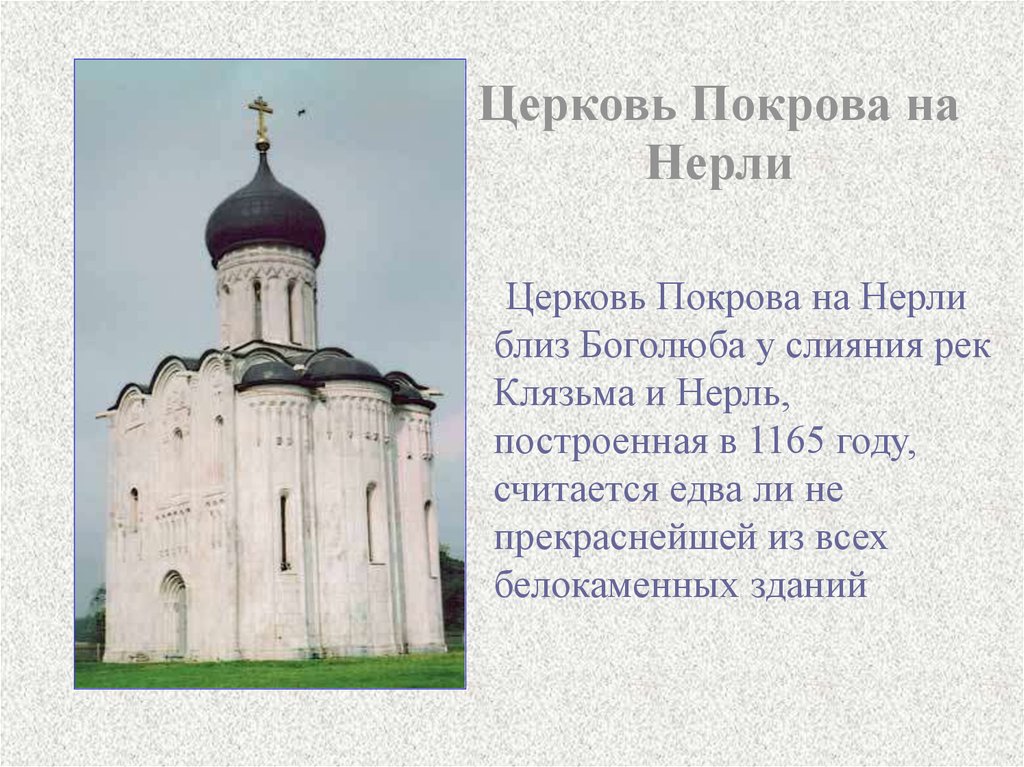 «Сии же князь Ондрея Боголюбовный град спом осыпа, постави ту церковь камену Рождество святеи Богородици на Клязьме реке, а другую Покров святеи Богородици на Нерли, и устрои монастырь».