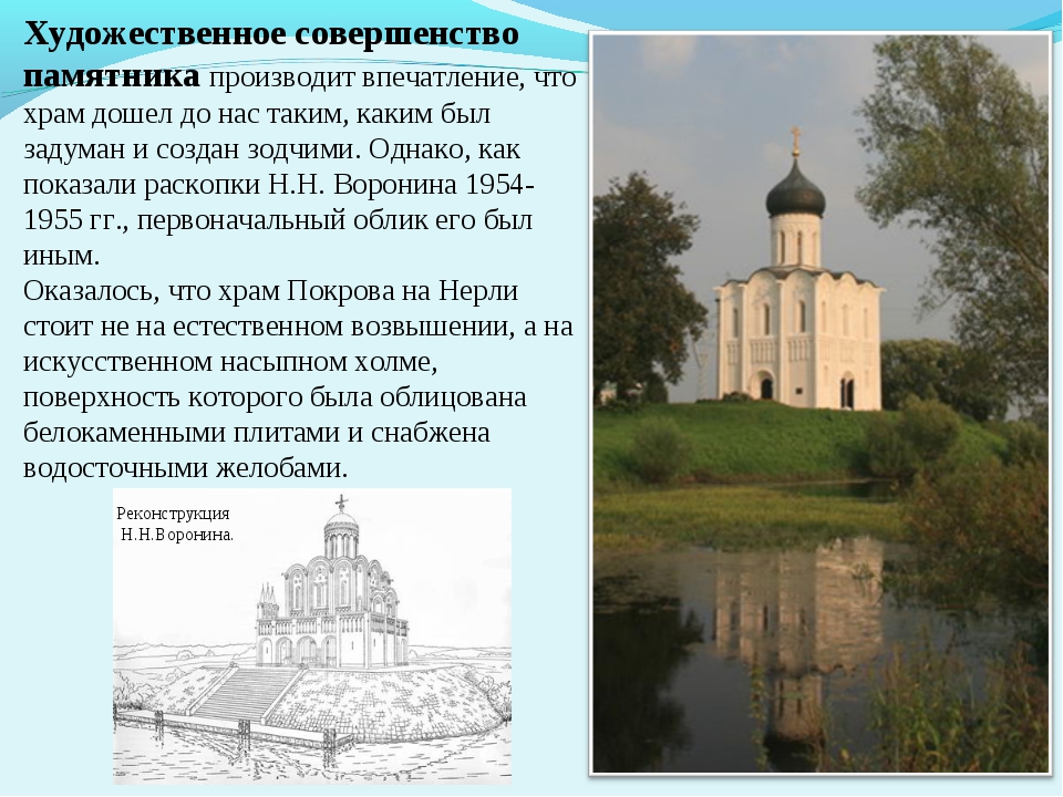 Как ни странно, вопреки расхожему мнению, что Советская власть только разрушали церкви, именно в советские времена была не один раз проведена научная реставрация церкви Покрова на Нерли, проведены археологические исследования основания церкви и реконструирован первоначальный её вид. Появились подвижники, которые посвятили древнерусской архитектуре всю свою жизнь и главный из них Николай Николаевич Воронин. Он вёл беспрецедентные и до сих пор непревзойденные по масштабам и научной значимости археологические исследования в Боголюбове, Владимире, Суздале, Переславле-Залесском и других местах.
