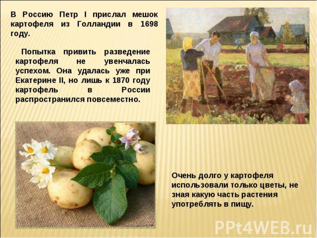 В Россию картофель попал из Голландии при Петре I. Сначала картофель, как и везде, считался диковинным растением с красивыми цветками и странными клубнями, которые то ли можно есть, то ли нельзя. Называли его, как и во Франции, «земляным яблоком», готовили как редкое лакомство на дворцовых банкетах и ели с сахаром. Предубеждение против картофеля усиливалось и звучанием самого названия, так как многим слышалось «крафт тойфельс», что в переводе с немецкого «чертова сила». Особенно это пугало священников, которые охотно присоединялись к рассказам разных небылиц о картофеле. Например, что картофель на самом деле родится с головой и глазами, как человек, поэтому есть его значит есть души человеческие.