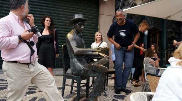 Решили, что на сегодня церквей хватит. Дошли до главной пешеходной улицы Аугушту и прошли ее всю. Очень красиво выложена мозаикой, можно идти и смотреть под ноги. Витрины тоже очень красивые. Столики ресторанов вынесены в центр улицы. Много живых фигур, уличных музыкантов, из окон доносится фаду, работают фокусники, слева увидели знаменитый лифт Санта Жушту, который соединяет нижний и верхний город. Вышли в сердце города площадь Россио, уже начинали зажигаться фонари. Был очень удачный час, когда еще светло, но фонари уже начинают светятся. Площадь выложена мозаикой в виде волн, на ней высокий памятник королю Педро, не помню, какому по номеру, два красивых фонтана, и завершается она классическим зданием Национального театра.