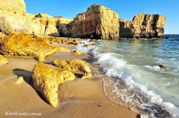 - Praia do Castelo – наш любимый пляж в Алгарве (на фото), которому присвоено звание пляжа №1, находится между Албуфейрой и Лагошем. В окрестностях нет отелей, поэтому контингент в основном местные и самостоятельные автопутешественники. Ресторан Pic Nic открыт круглый год, вид на океан и ярко желтые скалы неописуемой красоты. (37.07354, -008.29812)