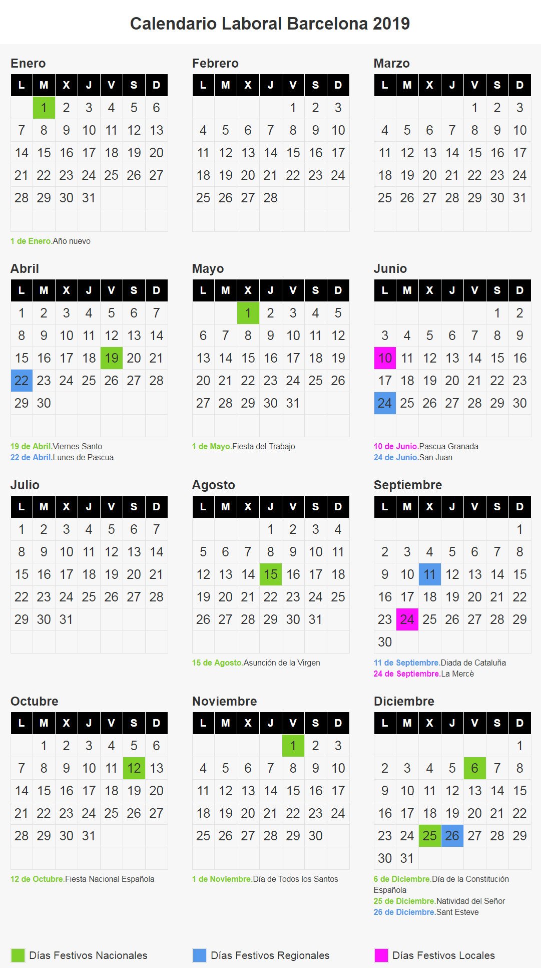 Испания славится тем, что количество официальных праздников составляет здесь около полутора десятков, однако в разных регионах не все из них являются выходными днями. Все испанцы отдыхают в Рождество, в День трех королей, в Пасхальную пятницу, 15 августа (день Вознесения богоматери), 1 ноября (День всех святых), 8 декабря (Непорочное зачатие Пресвятой Девы Марии), 12 октября (Национальный день Испании), 6 декабря (День Конституции). Помимо этого есть и различные региональные и муниципальные праздники, которые также могут являться выходными днями.