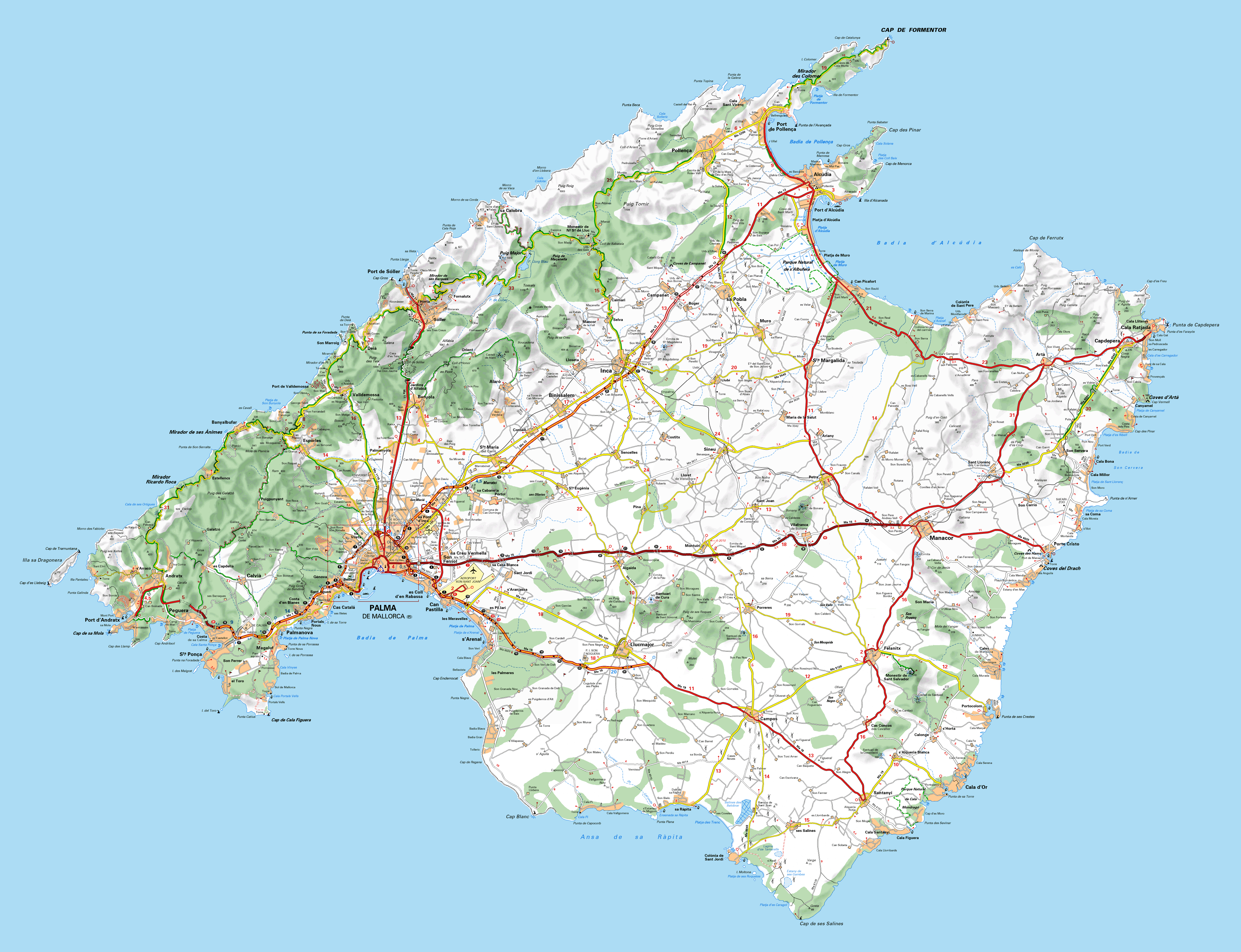 Северо-западное побережье целиком занято хребтами Серра-де-Трамунтана, в центре лежит обширный останцовый массив, а юго-восточное побережье обрамлено цепью невысоких и сильно разрушенных гор Серрес-де-Льевант.