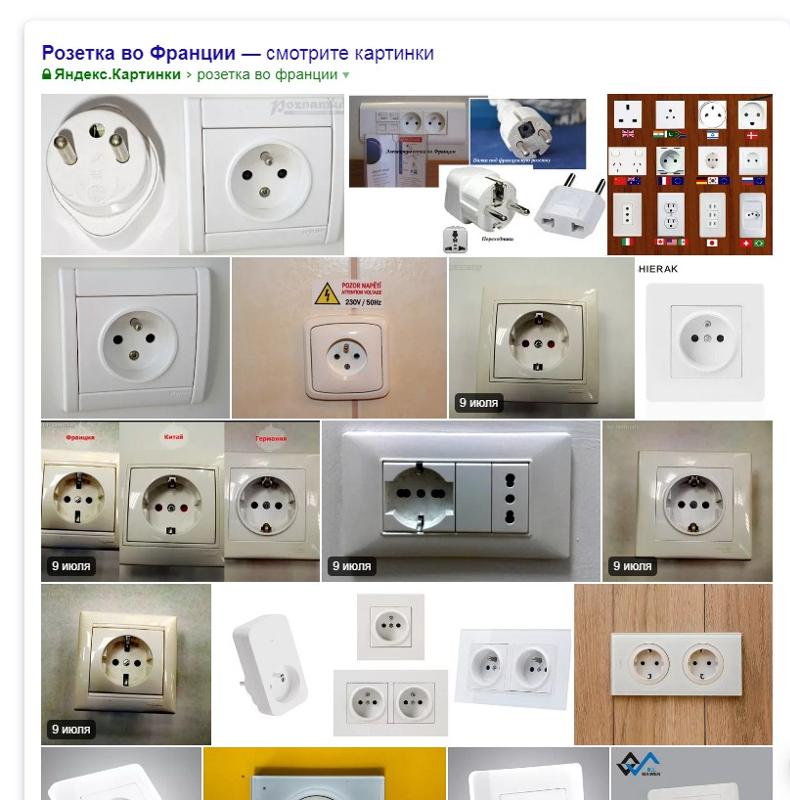 Розетки во Франции – обычные европейские типа С и типа Е (на фото), напряжение и частота тока стандартные. Иногда нужен переходник, как для прежних чайников фирмы «Тефаль», но чаще всего полезен тройник и удлинитель, так как розетка в номере отеля будет в единственном числе.