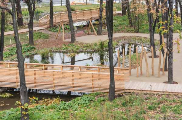 Для детей — недалеко от входа со стороны Москворецкой улицы работает бесплатная игровая площадка с лазилками из дерева. Рядом — скамейки из бревен.