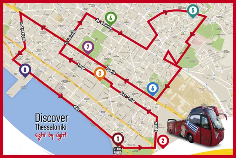 Красный автобус с желтой надписью SightSeeing Thessaloniki начинает свое движение от Белой башни каждые 40 минут, сам маршрут занимает 1 час 10 минут.