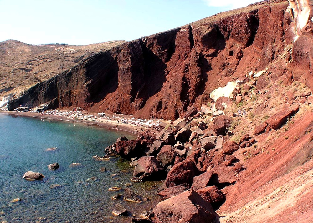 Как добраться: сначала из Фиры на автобусе до деревни Акротири, а затем пересесть на катер до Красного пляжа. Можно доехать самостоятельно на автомобиле, но от парковки предстоит спуск