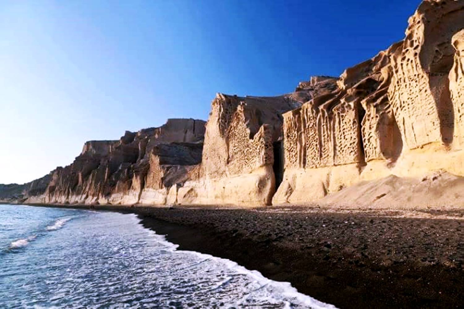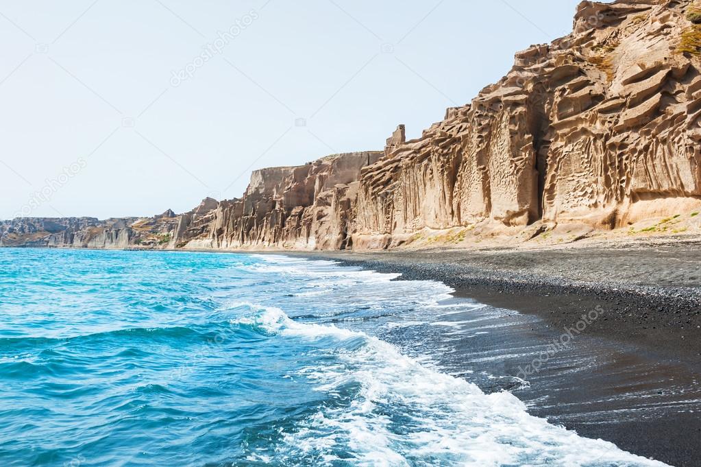 Темно-черный песок Периссы является культовым благодаря явному контрасту с насыщенным синим цветом кристально чистой воды.