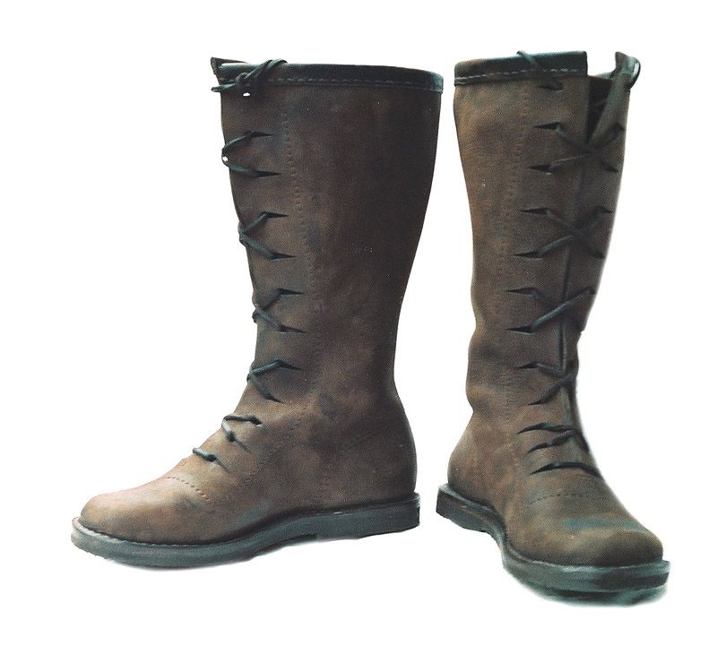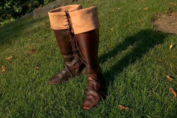 Сапоги до бедра из прочной кожи обеспечивали дополнительную защиту ног.Верх голенища обычно привязывался к поясу. Парадные сапоги часто шили прямо на ногу владельца, чтобы они сидели как влитые.