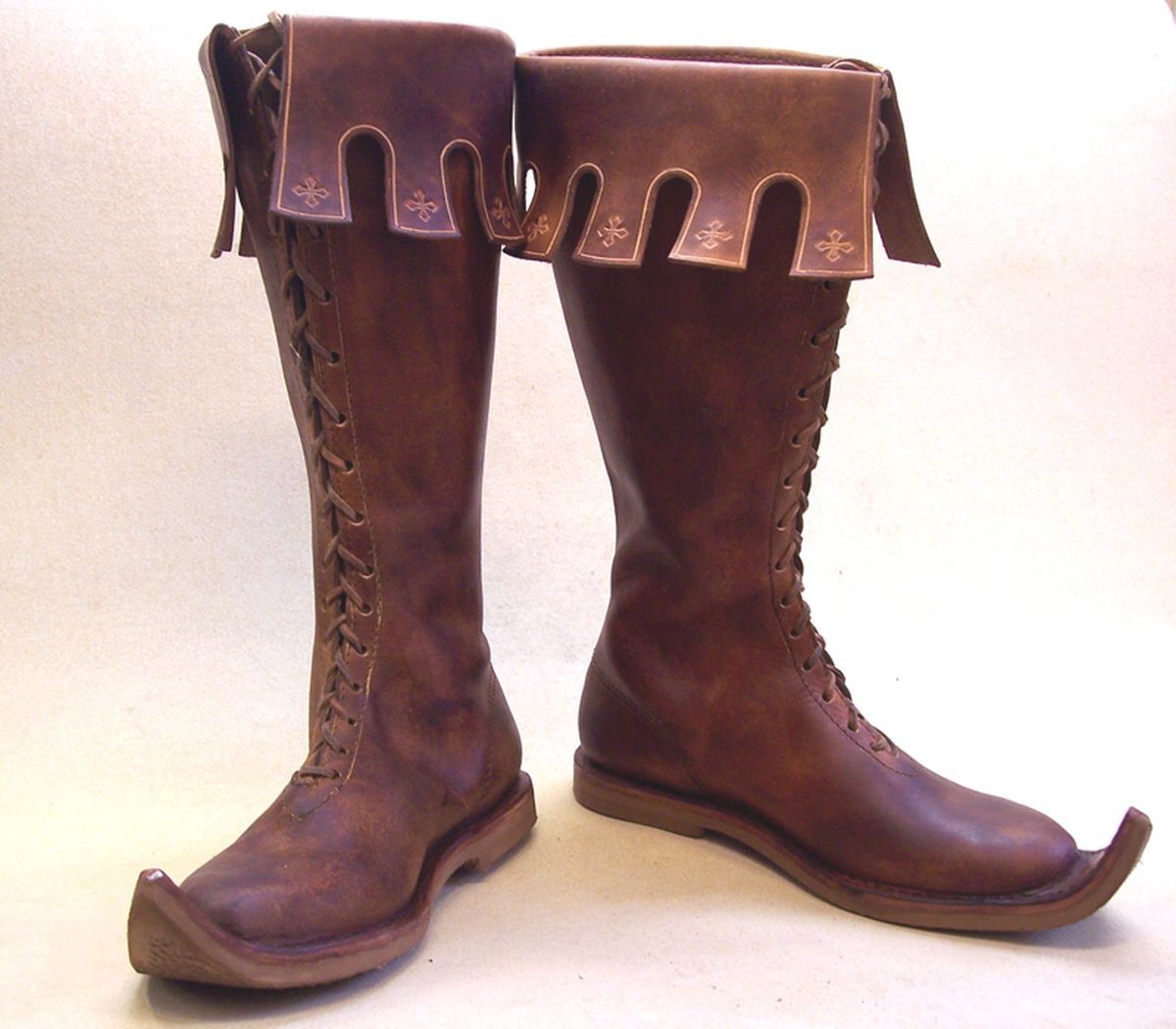 Обычные сельские жители носили обувь до колен и обматывали шнурками спереди. Средневековая обувь для знати и рыцарей, напротив, была сделана из высококачественной синтетической кожи и имела низкий каблук. Эти туфли были доступны в различных стилях.