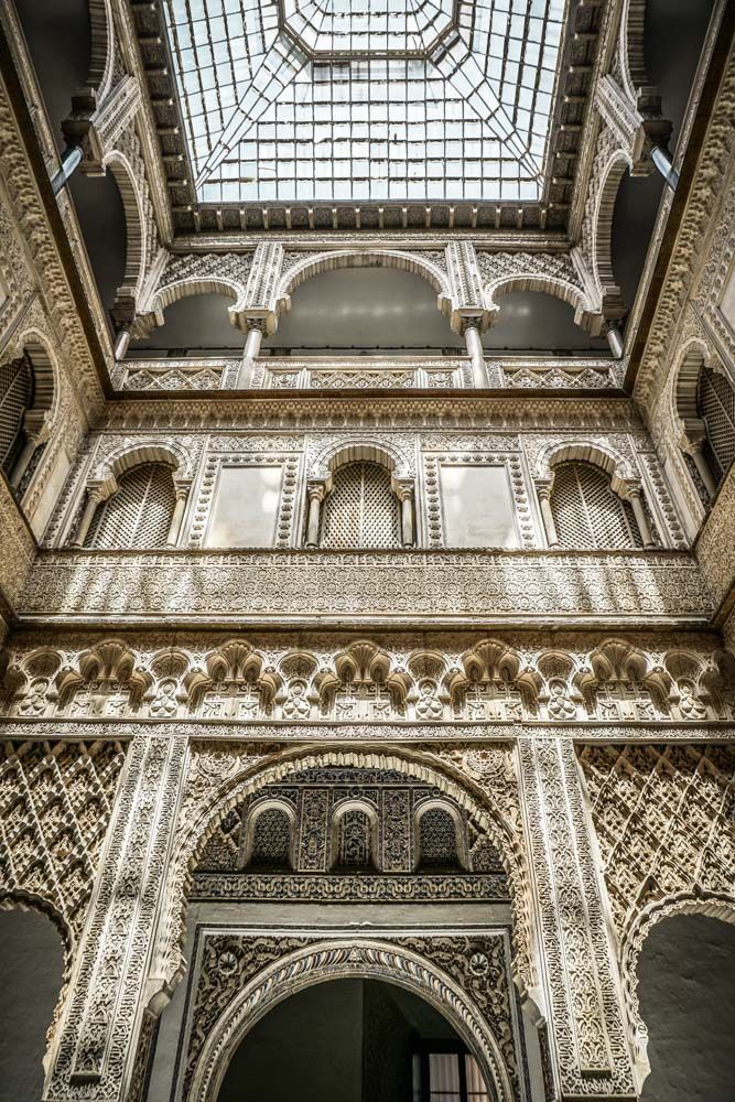 Deze zaal is dankzij haar geometrische details , opvallende marmeren zuilen en verfijnde houtsoorten een echt pronkstuk van de Mudejarstijl. Om nog maar te zwijgen van de Wondermooie felgouden koepel . Het ‘Salón de Embajadores’ mag niet ontbreken tijdens je bezoek aan hetpalis, je zal hier werkelijk je ogen uitkijken.