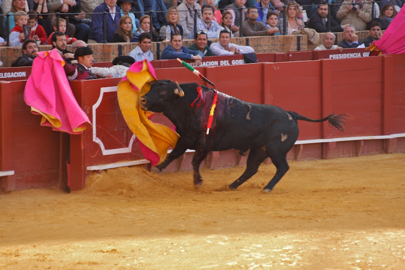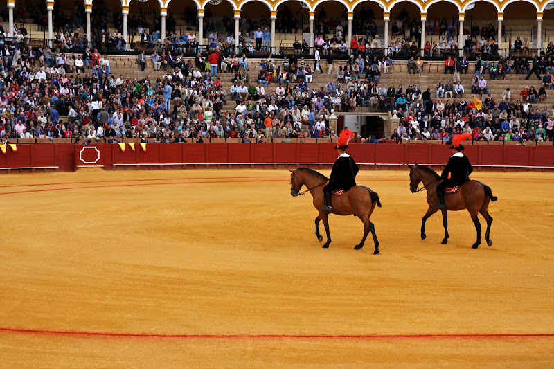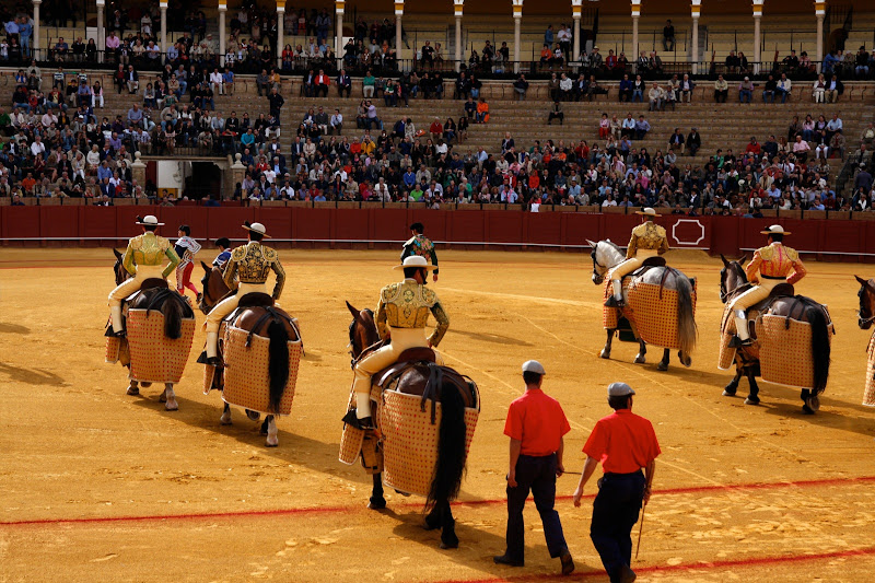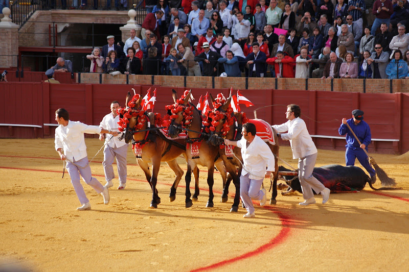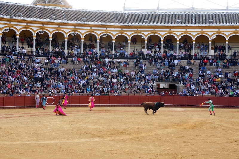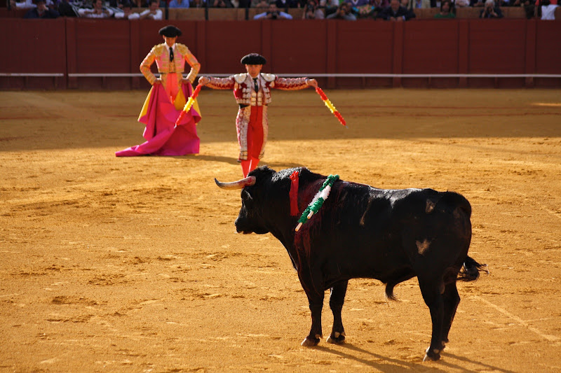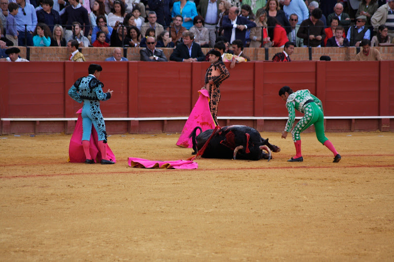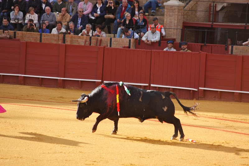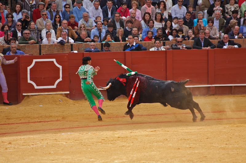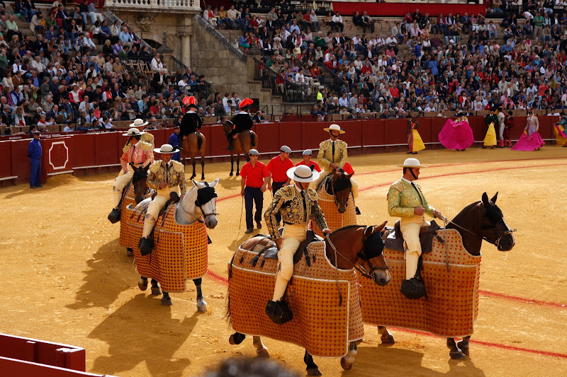 Все началось вовремя с группы, за которой последовали матадоры, пикадоры. Я не буду описывать каждого человека (подробно о корриде можно прочитать на www.gospain.com), но это было великолепно и смертельно серьезно. Ошибки отмечались свистом толпы, а отличные / рискованные ходы «олесами» и аплодисментами.
