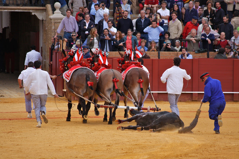 Семьи с маленькими детьми могут спорить о том, что быков убивают — там кровь и запекшаяся кровь, много брызг крови вокруг, когда меч вонзается домой, и капает со сторон быков в лужи на песок, быки последние хрюкали действительно громко, когда он падает на колени, чтобы умереть, вспышки ножей, когда сонная артерия перерезается на конце, и громкий треск хлыста, когда его труп привязан к упряжкам лошадей и утаскивается с арены.
