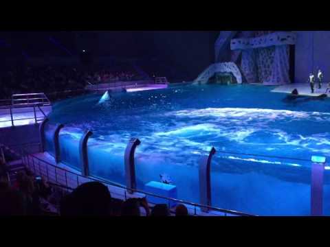 Финальный номер исполняют три касатки. Они выпрыгивают из воды и машут на прощание хвостами.