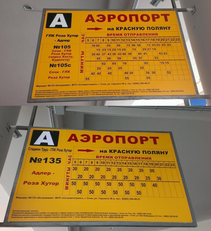 Автобус Адлер – Красная поляна (№ 135)Маршрут: В Адлере остановка автобуса в Красную Поляну около торгового центра «Новый век» (район центрального адлерского рынка). Конечная — горнолыжный комплекс «Роза Хутор».