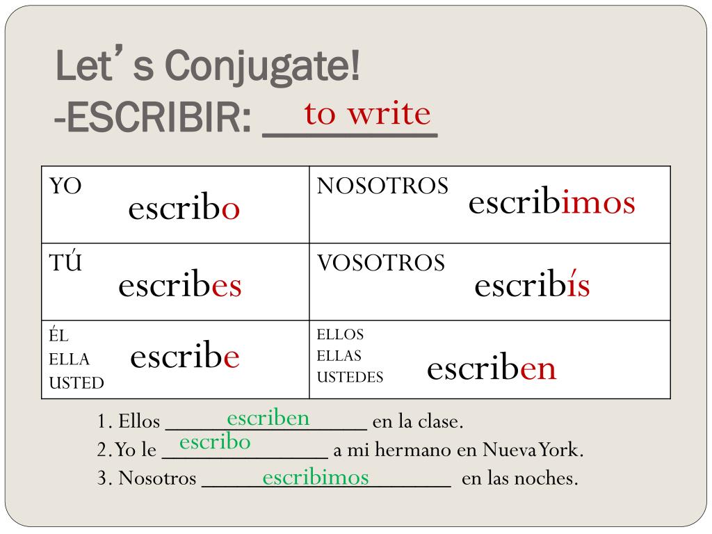 Ella / Él / Usted vea (вам официально) см.! Носотрас / Носотрос веамос посмотрим! Восотрас / Vosotros вед (тебе во множественном числе) смотри! Эллас / Эллос / Устедес веан (вам множественное число формальный) см.! Красная точка () выше обозначает неправильное сопряжение.