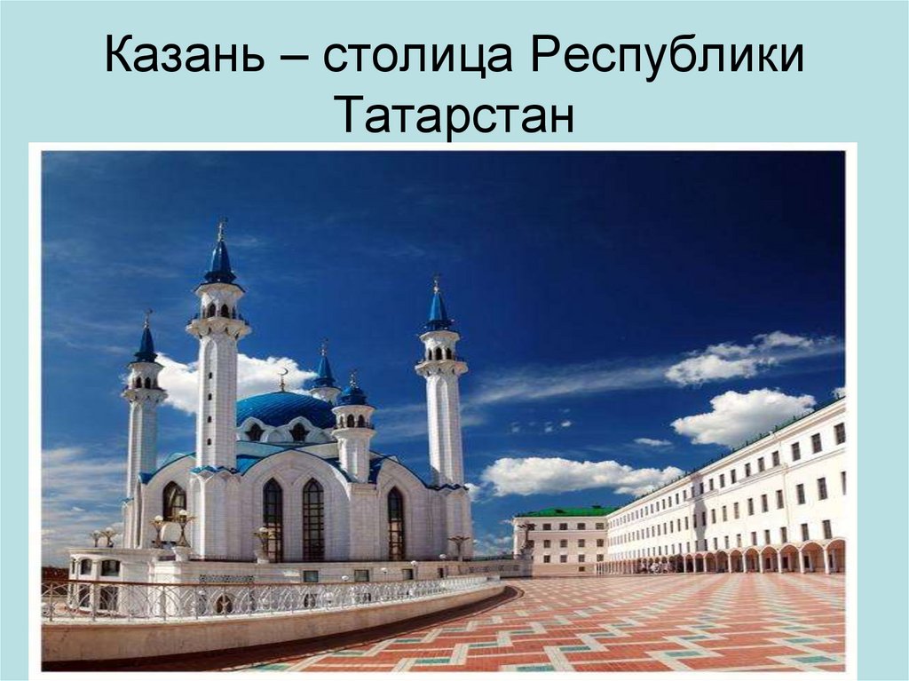 Столица Республики Татарстан — город Казань расположен на северо-западе Татарстана. Город протянулся вдоль двух берегов реки Казанки — у места ее впадения в Волгу. На территории Казани исторически проживают представители разных народов. Здесь можно услышать речь более 100 национальностей. Число жителей на сегодня составляет порядка 1,2 миллиона человек.