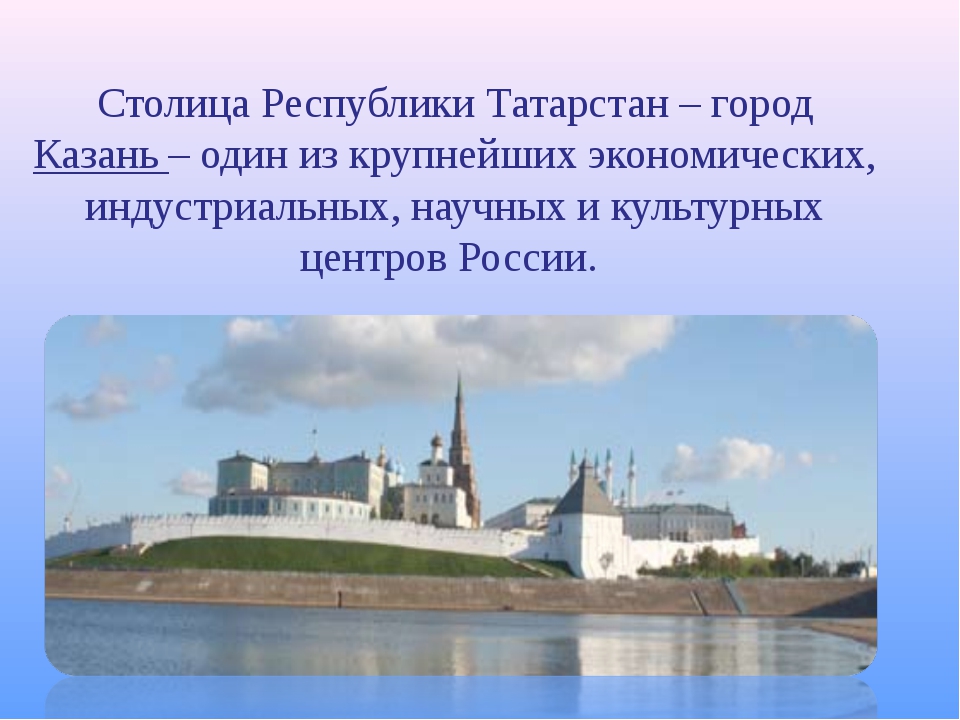Казань — очень красивый город, особенно летом. Наш город официально признан третьей столицей России, спортивной столицей. Так как в нашем городе проводится большое количество соревнований международного класса. Например: Летняя Универсиада 2013, Чемпионат мира по водным видам спорта 2015, Кубок Конфедерации 2017, Кубок мира и др.