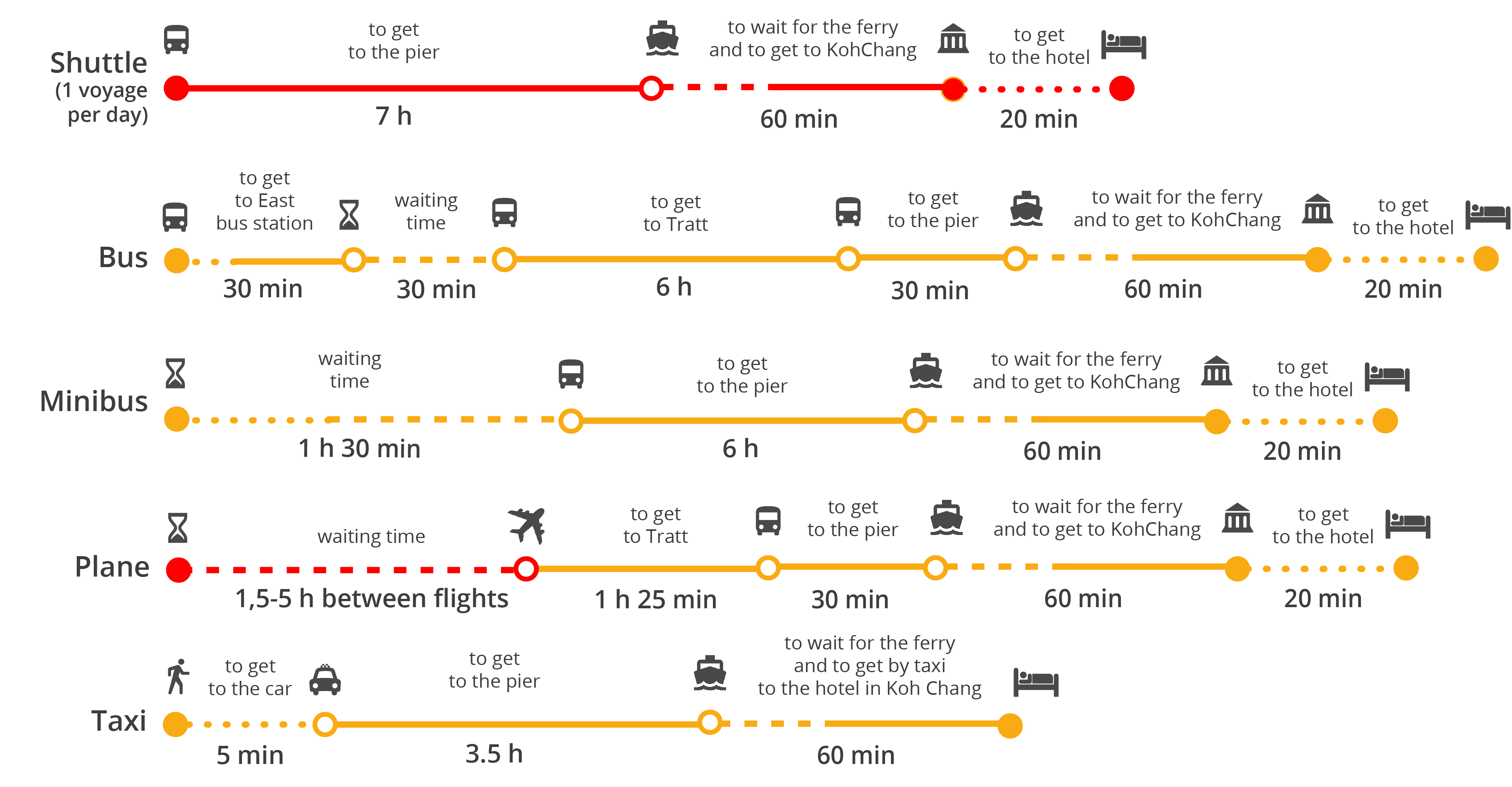 Автобусы ходят медленно на некоторых линиях, а по некоторым направлениям пассажирам приходится пересаживаться на другие линии, чтобы добраться до места отдыха. Однако некоторые из крупных курортов предоставляют трансфер до своих отелей.