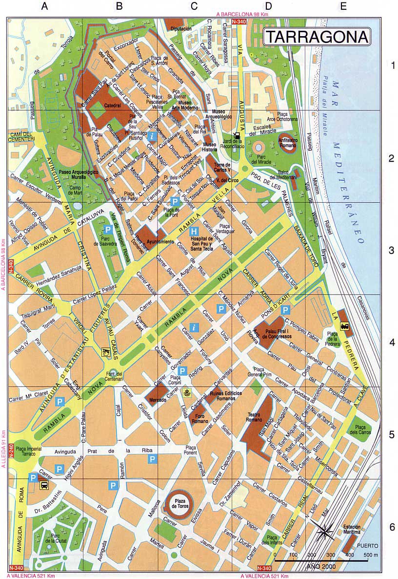 На карте также отмечено расположение автобусного и железнодорожного вокзалов. Расположение некоторых музеев в Таррагоне.