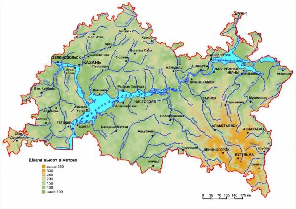 Территория Татарстана представляет собой возвышенную ступенчатую равнину, расчлененную густой сетью речных долин. Широкими долинами Волги и Камы равнина разделена на три части: Предволжье, Предкамье и Закамье. Предволжье с максимальными высотами 276 м занимает северо-восточную часть Приволжской возвышенности. В Восточное Предкамье с севера заходят южные окончания Можгинской и Сарапульской возвышенностей, разделенные долиной р.Иж. Наибольшие высоты достигают здесь 243 м. Самой высокой в Татарстане (до 381 м) является Бугульминская возвышенность в Восточном Закамье. Самый низкий рельеф (в основном до 200 м) характерен для Западного Закамья.