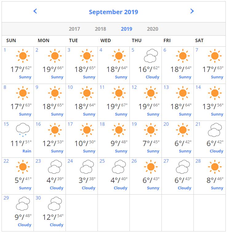 Осадков наблюдается несколько больше, чем в августе, но количество ясных деньков впечатляет – как правило, их не менее 21. Продолжительность светового дня постепенно сокращается, что неудивительно – приближается зима. Сентябрьские ливни еще не холодны и кратковременны. Ветер чуть усилится, в среднем будет дуть со скоростью около 5 м/с. Пыльных бурь опасаться не следует.