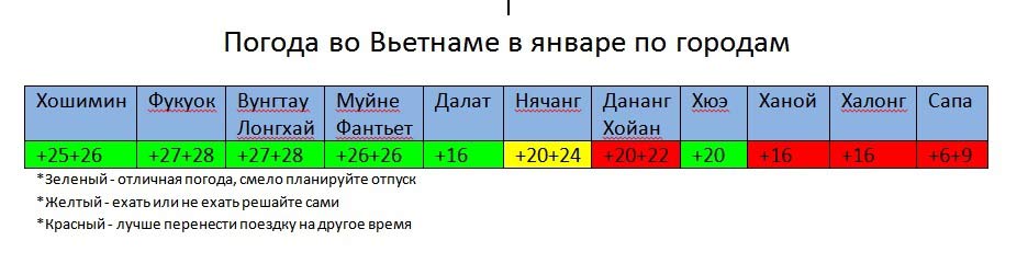 В середине зимы погода во Вьетнаме вполне подходит для курортного отдыха, хотя температурные показатели января самые низкие в году: днем +23…+28 °С, а морская вода нагрета только до +23…+24 °С.