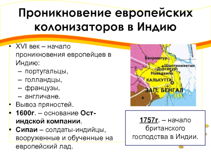 В первой половине XVIII в. некогда могущественная империя Великих Моголов, распространявшая власть почти на весь Индостан, оказалась в состоянии распада. Восстания и вторжения иноземцев сократили её территорию, и теперь Великие Моголы контролировали только часть Северной Индии. Ослаблением власти императора и состоянием хаоса в стране воспользовались европейские колонизаторы. Подчинить Индию они рассчитывали руками самих же индийцев, используя экономическое превосходство, а также религиозные и национальные раздоры среди местного населения. Соперничавшие между собой французы и англичане навязывали индийским князьям договоры о покровительстве, создавали отряды из наёмных солдат-индийцев (сипаев).