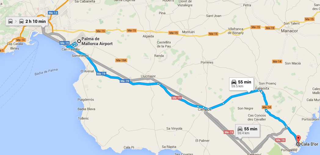 Такси из аэропорта Пальмы и трансфер с велосипедными ящиками на северо-восток: Кала Мескида с гостиничными группами компаний Viva и Vanity, Кала Агулла, Кала Ратьяда и Фонт-де-Са-Кала, с пышной природой, Каньямель, Кала-Бона, Кала-Миллор, С’Иллот-Са-Кома и Кала-Морейя, а также всемирно известный пляж на востоке острова — Порту. Кристо, Порто-Кристо-Ново, Кала-Мандия и Плайя-Романтика.