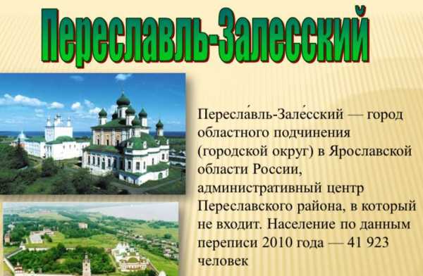 Этот город, также как Москва, был основан князем Юрием Долгоруким в 1152году. Юрий велел создать крепость, позже Переславское княжество объединилось с Московским. (В давние времена озеро Плещеево было богато рыбой и рыбу доставляли в Москву ,а рыбаки были призваны к службе государю ,так всем прочим было запрещено ловить рыбу) Он раскинулся на берегу живописного Плещеева озера. Переславль считается одним из заповедных и привлекательных городов Золотого кольца, а также считается родиной русского флота.