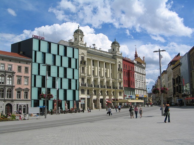 Старая ратуша – внутренний двор, Брненский дракон, портал Капустного рынка – барочный фонтан Парнас, театр Редута, статуя В. А. Моцарта, Колонна Святой Троицы, дворец Дитрихштейн